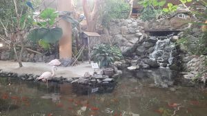 De flamingo's in de Market Dome van Les Bois-Francs geven een tropische uitstraling.